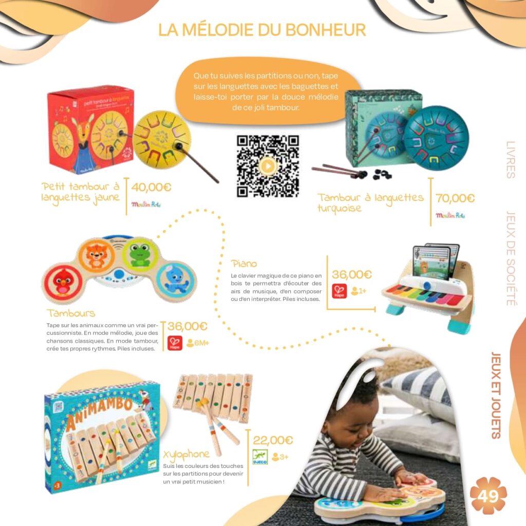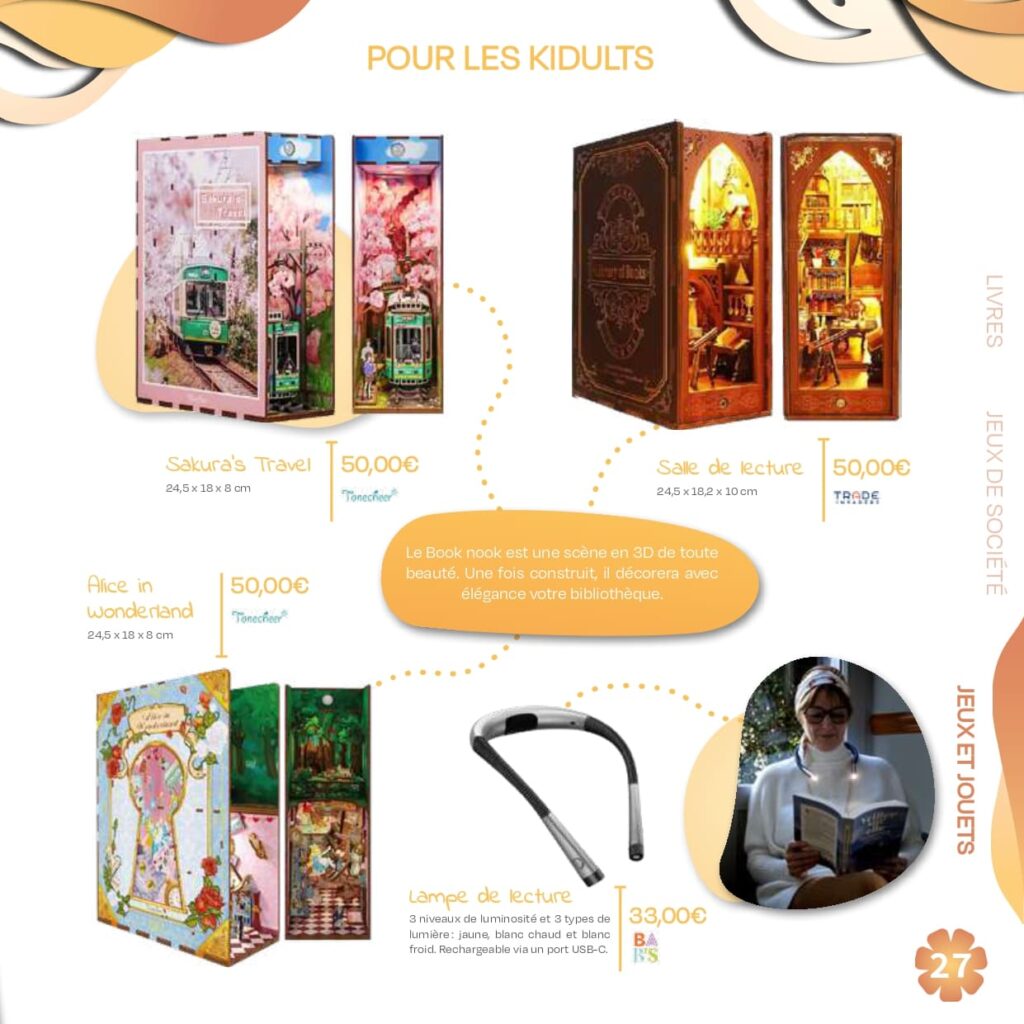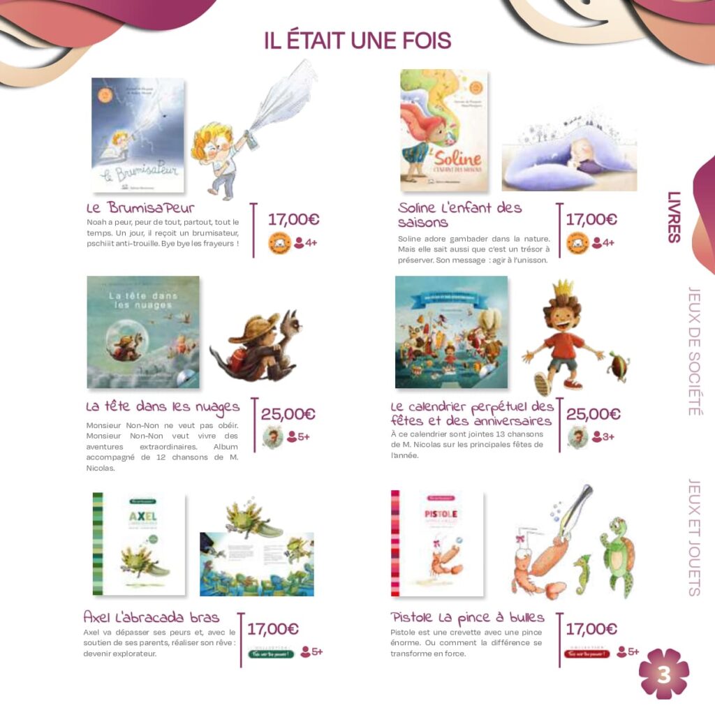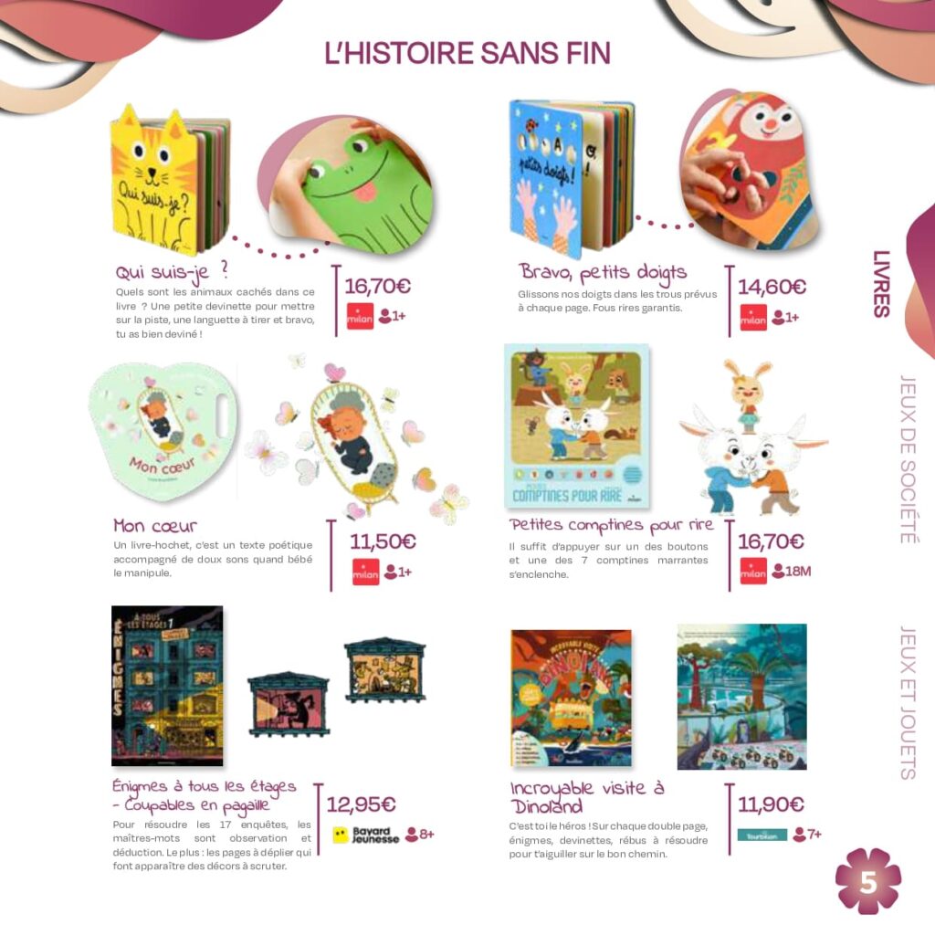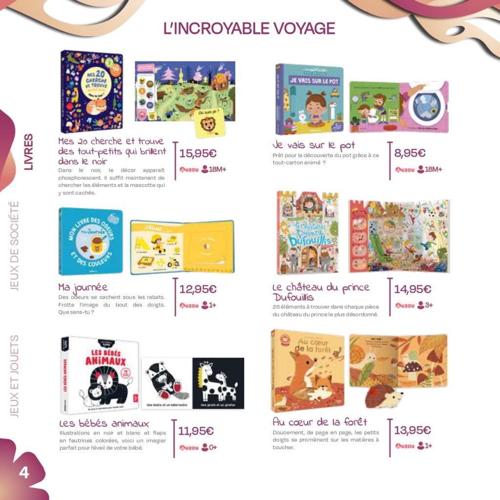 Le catalogue propose une riche collection de livres pour les plus jeunes, idĂ©ale pour l’Ă©veil et l’aventure. Parmi les nouveautĂ©s, dĂ©couvrez Le BrumisaPeur Noah, une histoire pour les 4 ans et plus Ă 17,00€, qui traite des peurs avec un « pschiiit anti-trouille ». Pour ceux qui aiment la nature, Soline L’enfant des saisons ( 17,00€) porte un message sur la prĂ©servation de ce trĂ©sor. Les tout-petits peuvent explorer Ma journĂ©e Ă 11,95€, ou s’amuser avec Mes 20 cherche et trouve des tout-petits qui brillent dans le noir ( 14,95€). Ne manquez pas les livres tactiles comme Au cĹ“ur de la forĂŞt oĂą les petits doigts se promènent sur des matières Ă toucher.