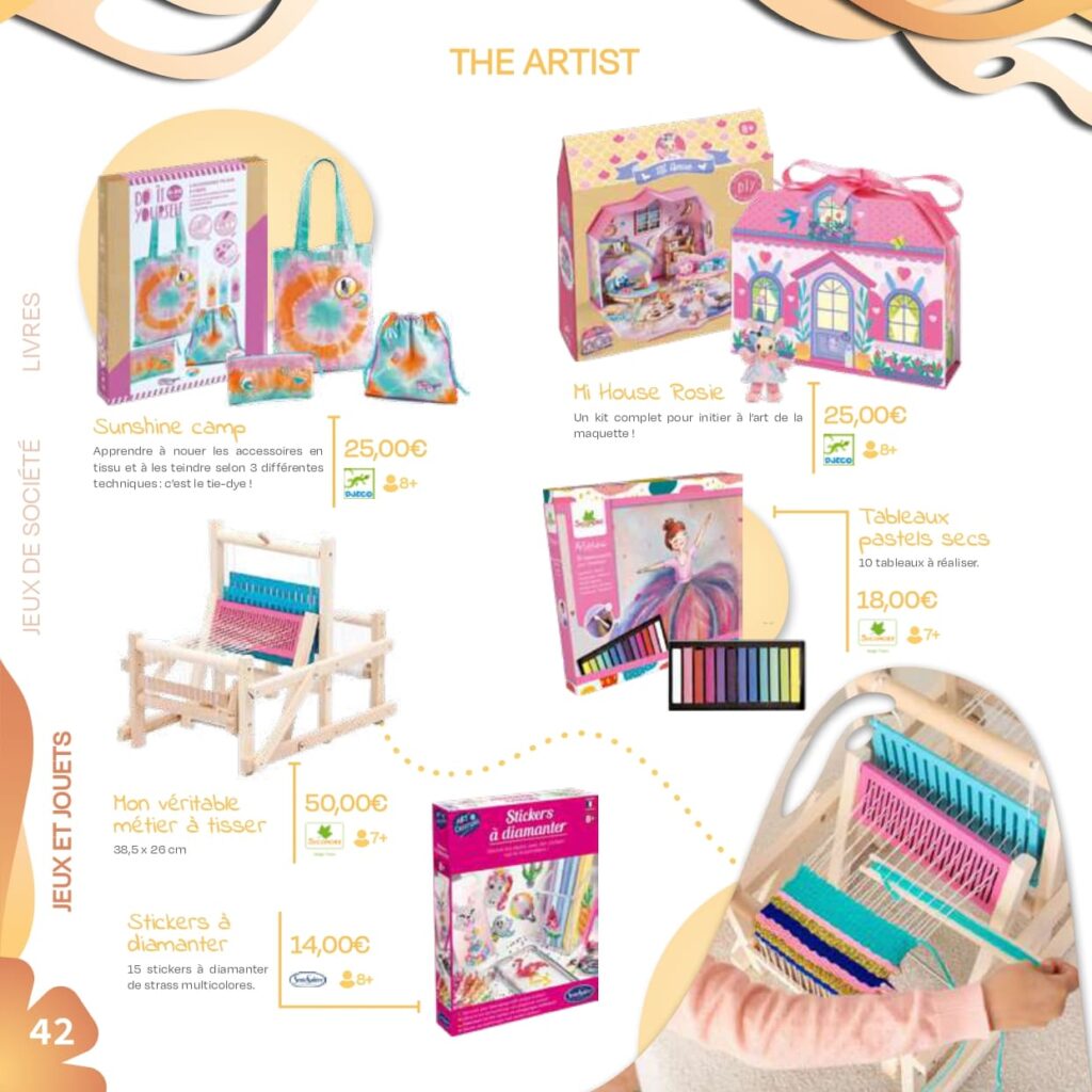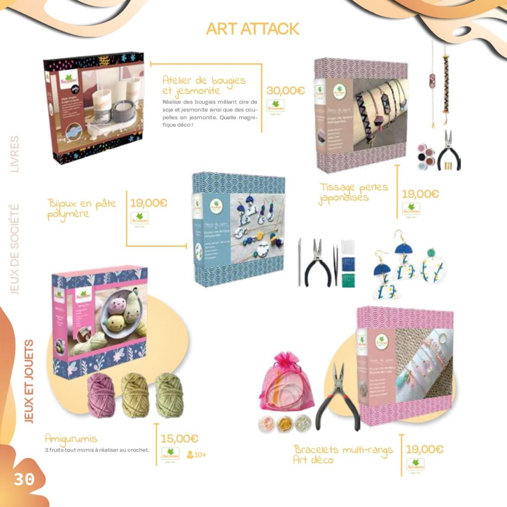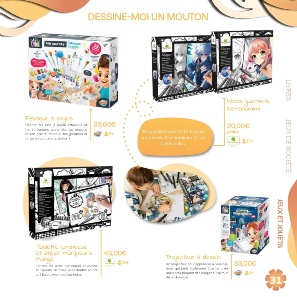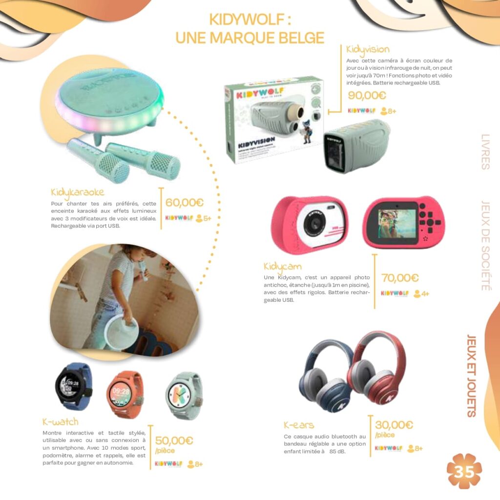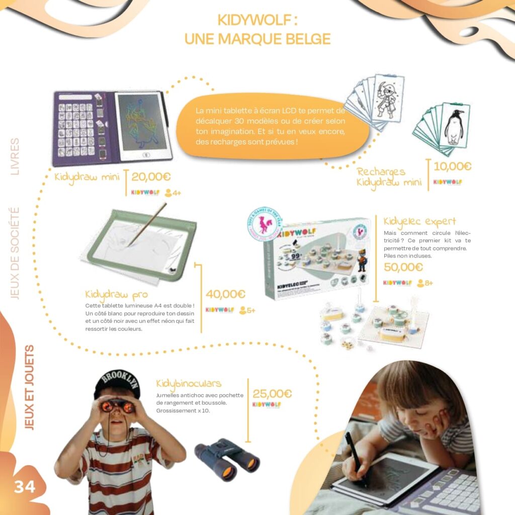 Le catalogue met en avant plusieurs pĂ©pites dans l’univers crĂ©atif et technologique. L’espace ART ATTACK propose des kits comme l’Atelier de bougies et jesmonite (30,00€) ou le Tissage perles japonaises (19,00€). Pour les petits gĂ©nies, la marque belge propose le Kidydraw mini ( 20,00€), une mini tablette Ă Ă©cran LCD pour dĂ©calquer 30 modèles. Les aventures ne sont pas oubliĂ©es avec la Kidycam ( 70,00€), un appareil photo antichoc et Ă©tanche jusqu’à 1m en piscine, ou encore la K-watch (50,00€), une montre interactive et tactile stylĂ©e.
